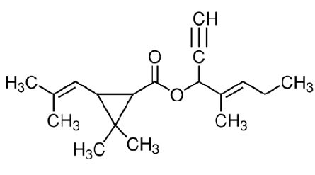 別名 烯炔菊酯 ;右旋反式炔戊菊酯, 烯炔菊酯,右旋-反式-2,2-二甲基-3-(2-甲基-1-丙烯基)環(huán)丙烷羧酸 (E)-1-乙炔基-2-甲基-戊-2-烯基酯;1-Ethinyl-2-methyl-2-penten-1-yl chrysanthemate